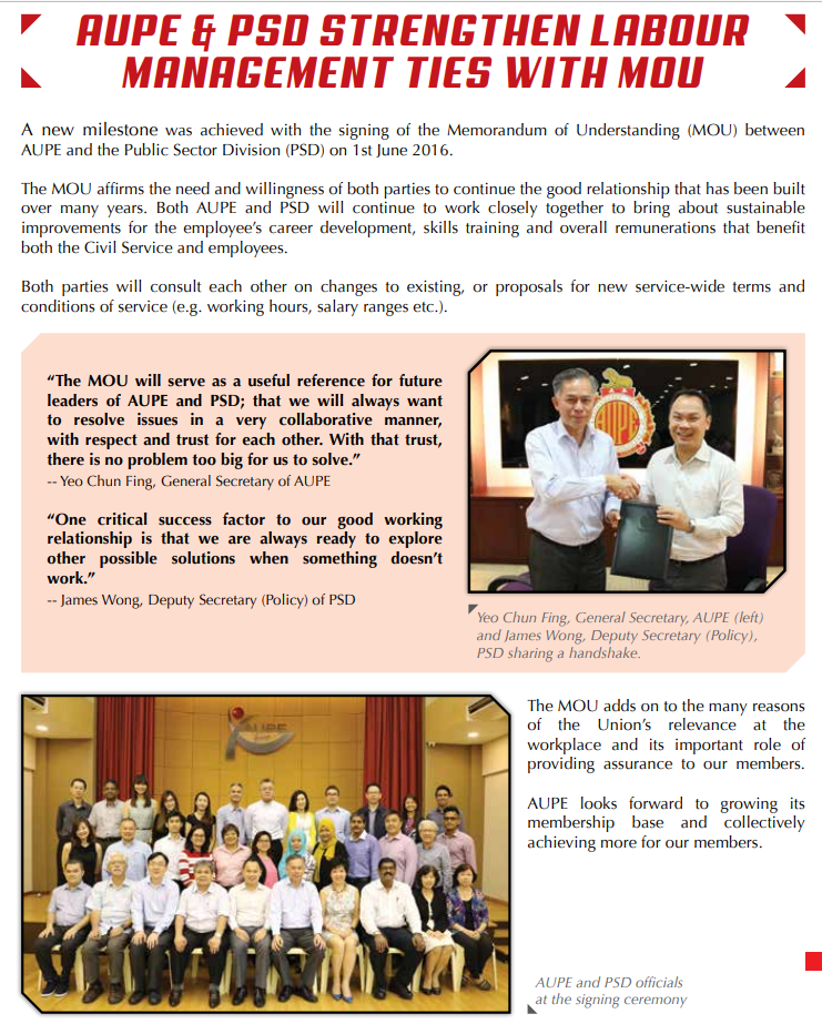 AUPE & PSD Affirms Labour Management Ties with MOU Membership2021-09-14T07:27:20+08:00 AUPE and PSD affirmed our commitment to work closely together to bring about sustainable improvements for the employee’s career development, skills training and overall remuneration. Related Posts What is AUPE G Kandasamy Scholarship? January 21st, 2025 Enhancement to Leave Provisions for Civil Service Officers January 10th, 2025 Singapore’s civil service ranked world’s best in Oxford University study: AUPE Celebrates its Public Officers Behind the Success December 13th, 2024
