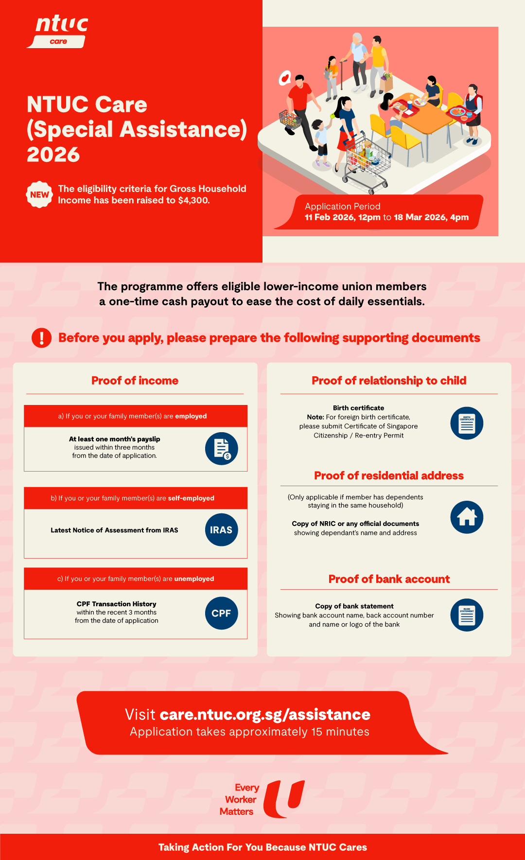 NTUC Care (Special Assistance) is here to support union members in coping with the rising cost of living.